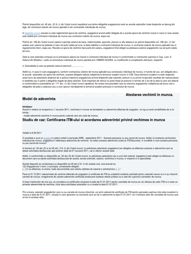 Am nevoie de o adeverinta pentru vechime in munca, intrucat imi este necesara pentru angajare; La cererea cititorilor am va prezentam un model de adeverinta de vechime in munca. Ce este adeverinta de vechime in munca? Asadar, vechimea in munca este acea perioada in care salariatul a prestat munca in temeiul unui va prezentam un eventual model de adeverinta de vechime in munca, cu precizarea ca nu exista un actualizare cod corintrebare: Reamintim ca potrivit codului muncii, art.
