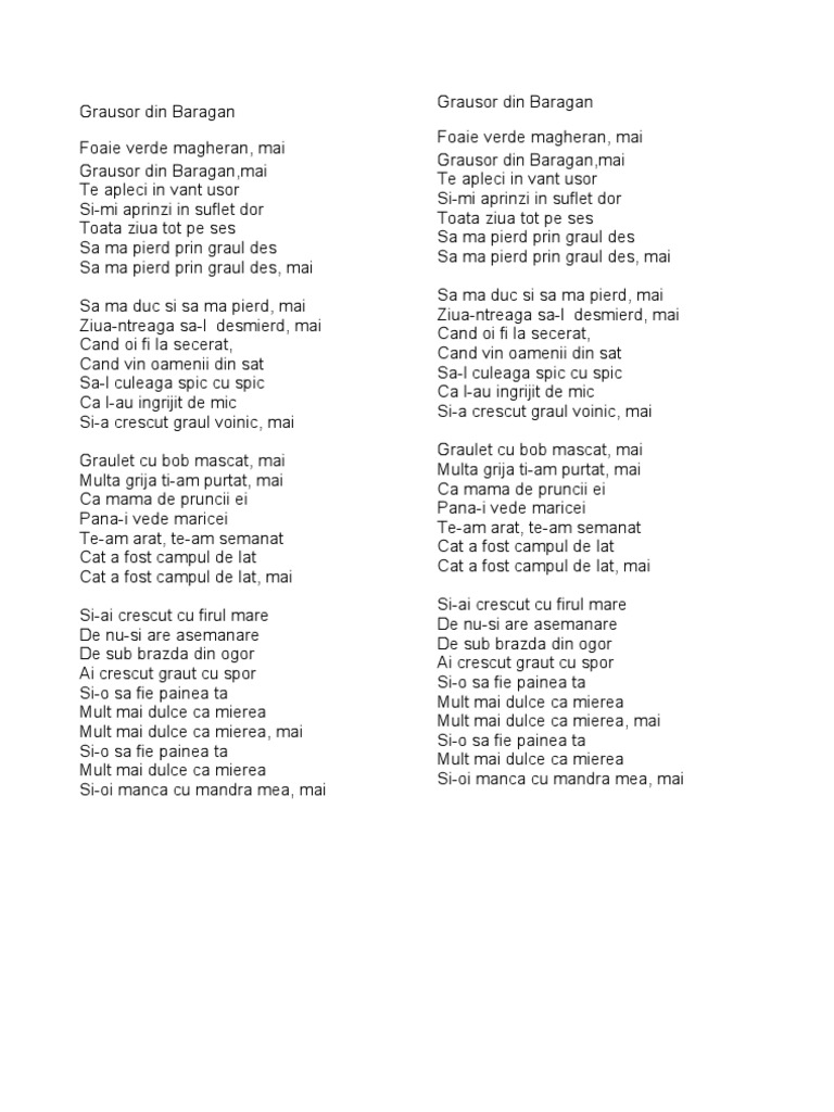 • foaie verde, grâu mărunt așa'mi vine să mă duc, măi. Versurile pot utiliza numai pentru uzul personal sau de educație. Păi foaie verde plop uscatu, plânge ardealul și banatul