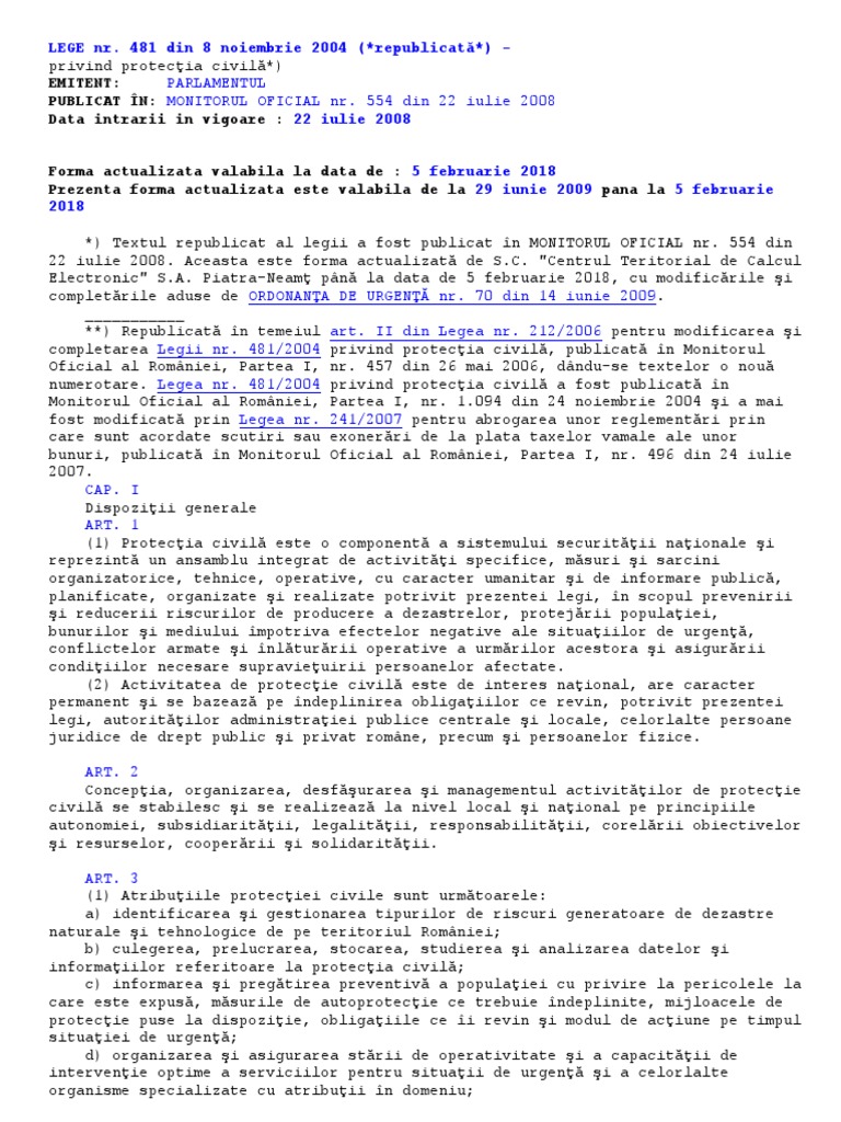 vizitati articolul complet aici : https://www.slideshare.net/PompieriiRomni/legea-nr-481-din-2004-privind-protectia-civila 481 din 8 noiembrie 2004 *** republicat ă privind protec ţ ia civil ă emitent: Mãsurile pe care le genereazã prezentul act normativ vizeazã interesul social, educaţional şi constituie situaţii de urgenta şi extraordinare. 481/2004 privind protecţia civilă, publicată în monitorul oficial al româniei.