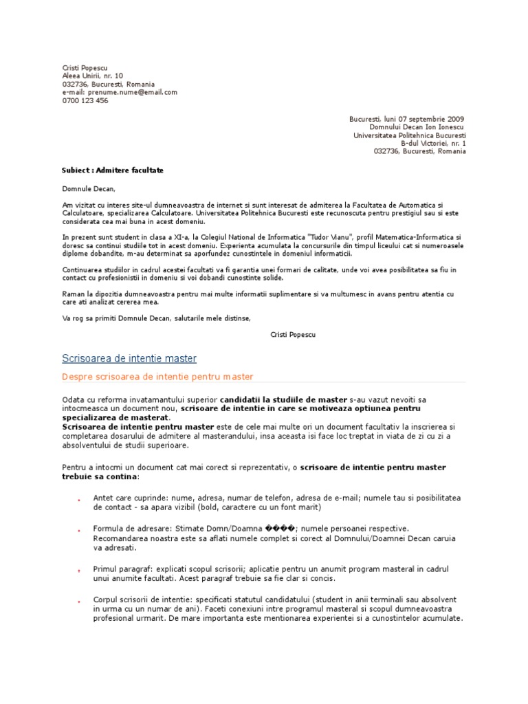 Este axat pe solicitantului combinaţie unică de abilităţi care concurenţii săi nu poate avea. Admitere facultate 2014 romaniatv net mobi. Cateva modele de scrisori de intentie generale sau specifice unor categorii de posturi pe care le puteti utiliza in crearea propriilor scrisori de intentie.
